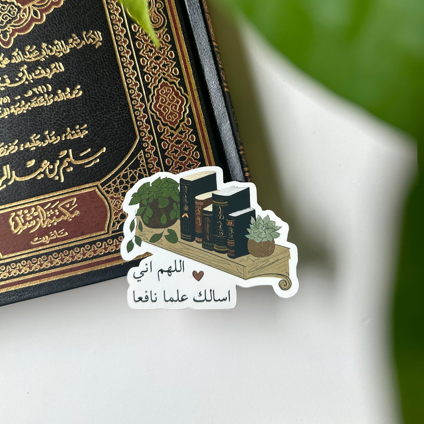 brighten your space with this elegant sticker featuring a hanging shelf with Islamic books, plants, and the dua: 'اللهم إني أسألك علماً نافعاً' (O Allah, I ask You for beneficial knowledge). perfect for notebooks, planners, or any surface.