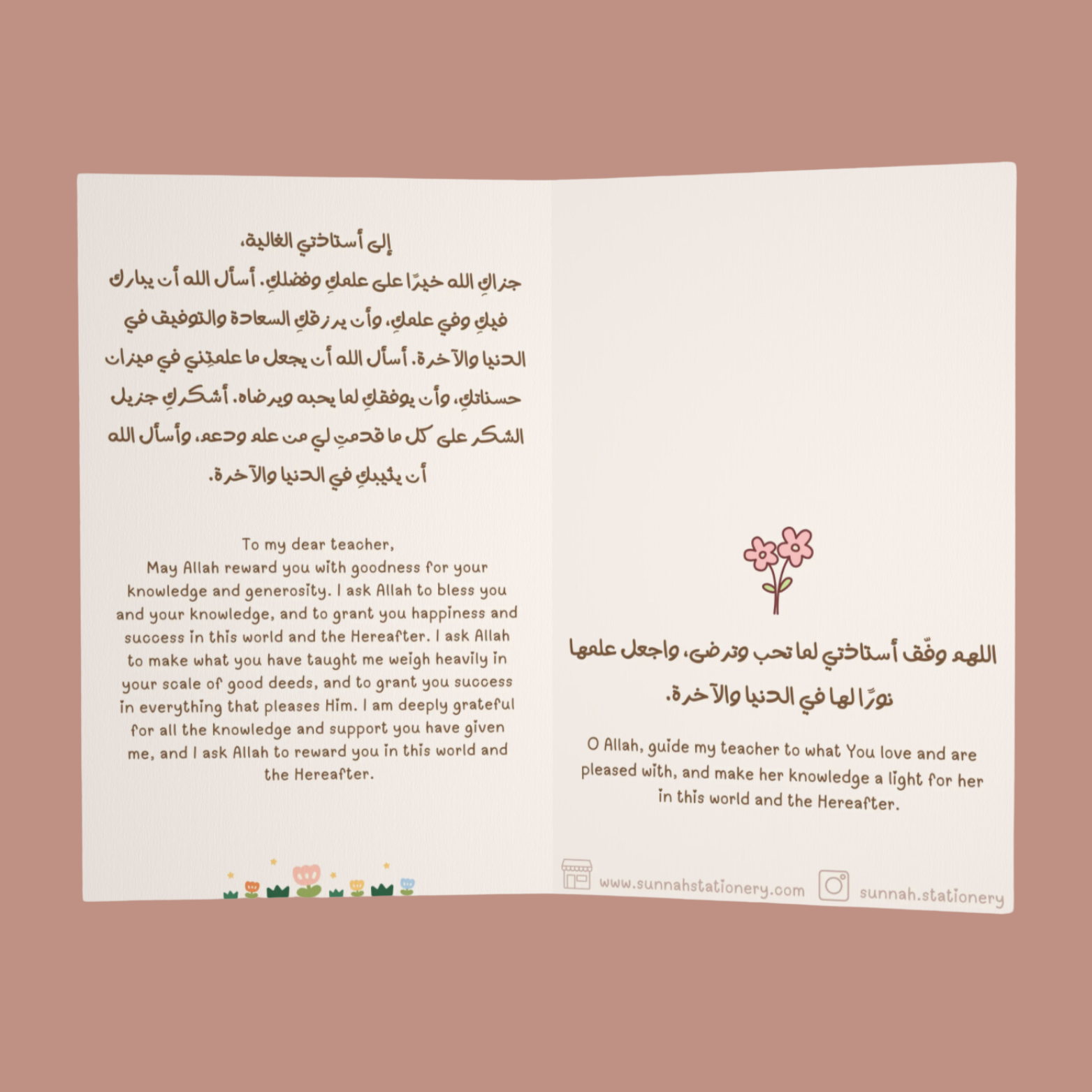 show your appreciation for a beloved teacher with this thoughtful card featuring a heartfelt Islamic touch. a beautiful way to thank them for their guidance and dedication.